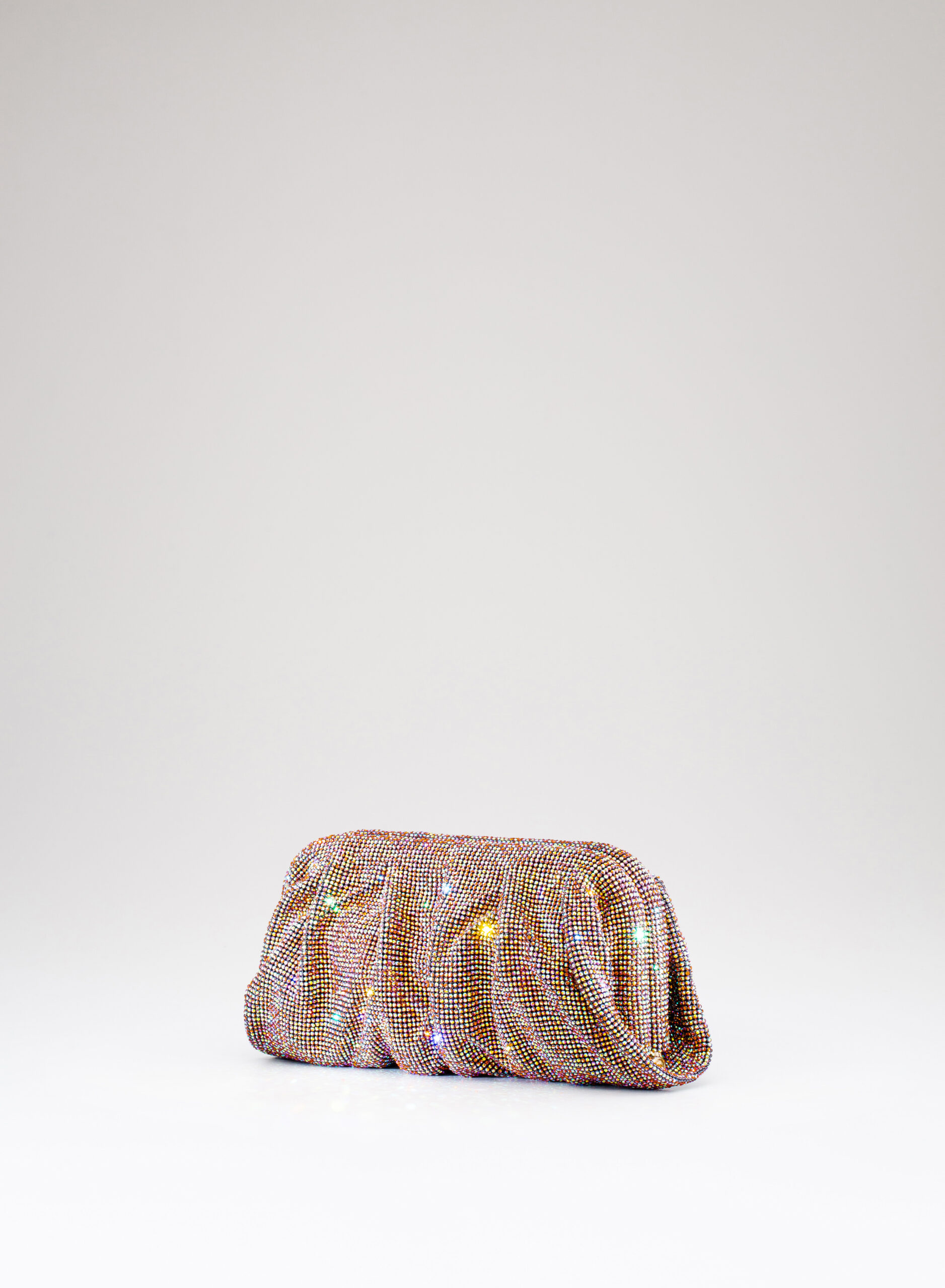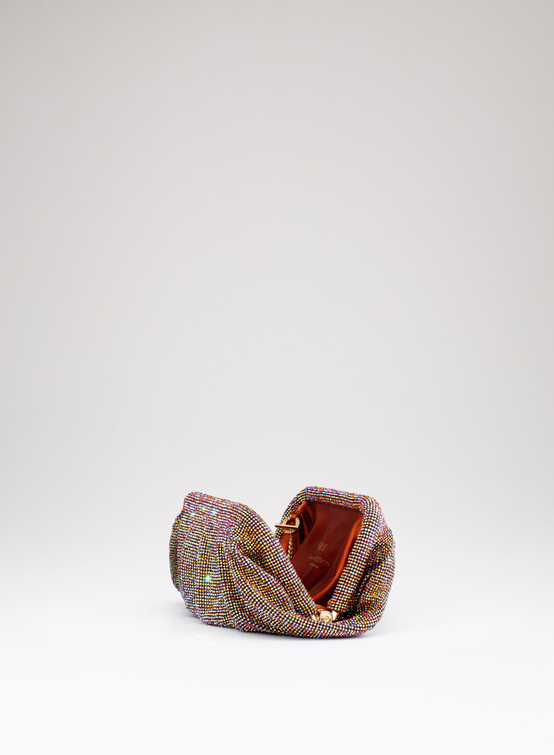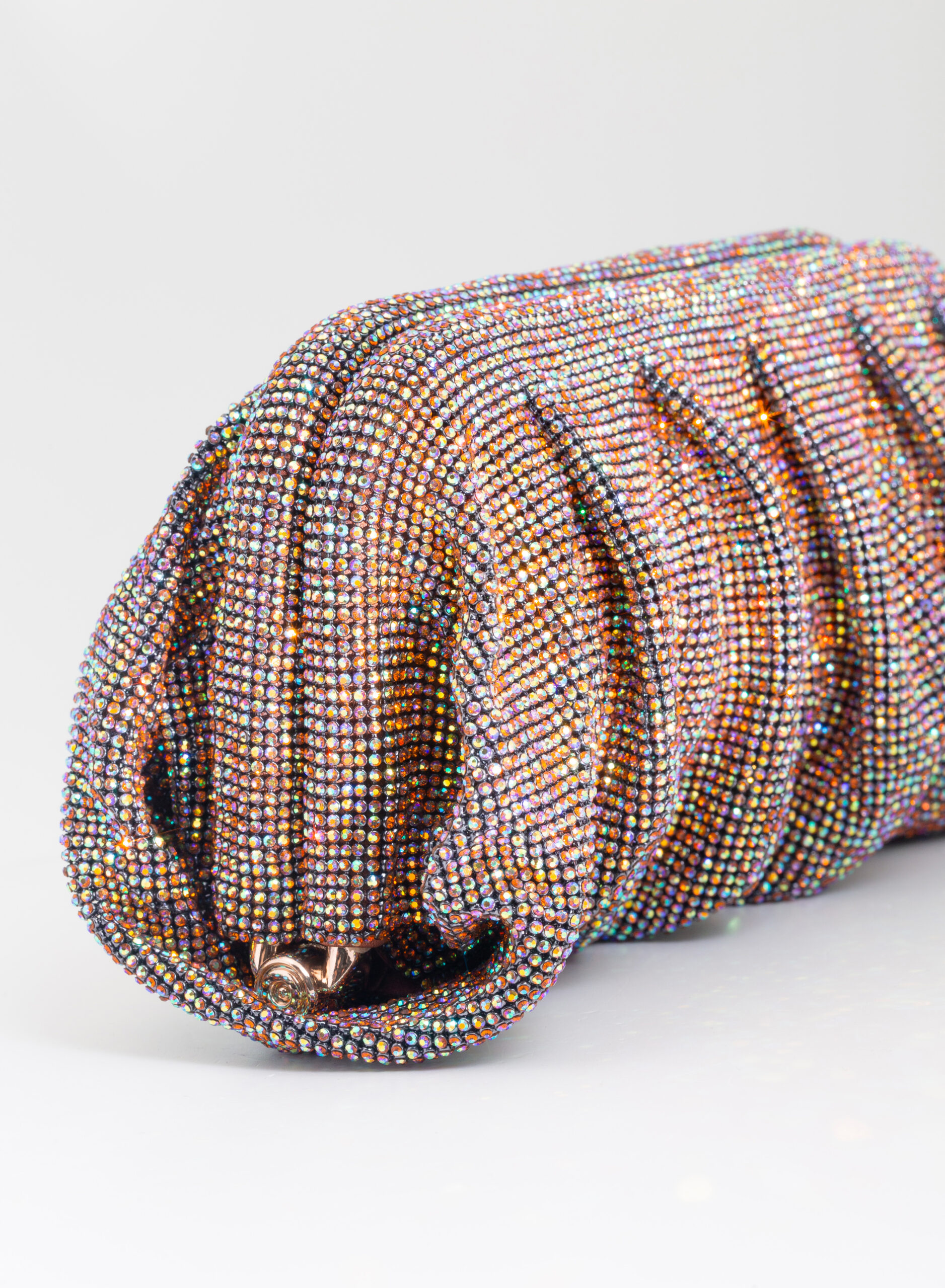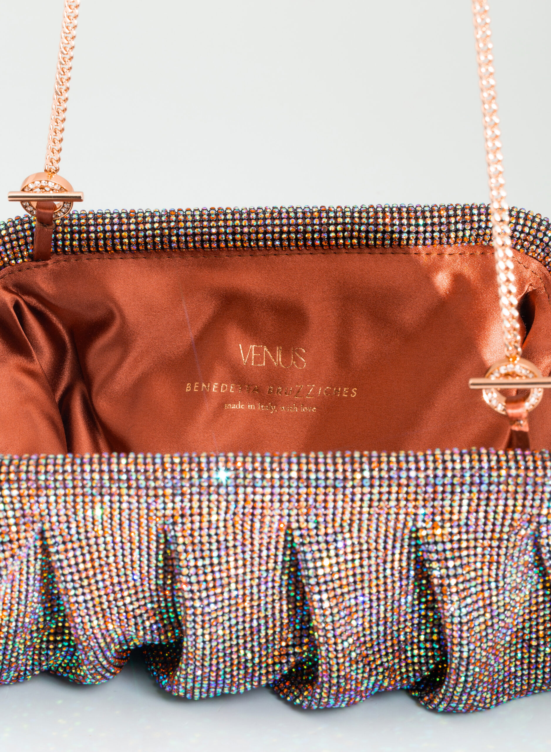 I welcome the love that flows through me like a wave that rolls, breaks on the rock and foams. Like a shower that smokes, boils and fertilizes the burning earth. Like a perfume that rises from the sea, it spreads and saturates the air around. So my body is reborn on Venus. This clutch is a tribute to the goddess of Love and Beauty and the magical moment in which every woman, who loves and is loved, is transformed. From mortal becomes goddess in a perfect personification of Venus. With soft and wavy shapes, Venus is made with a network of sparkling crystals sewn by hand with the same attention that would be devoted to a jewel. Inside, a denim clutch is ready to welcome the necessary for an evening out.