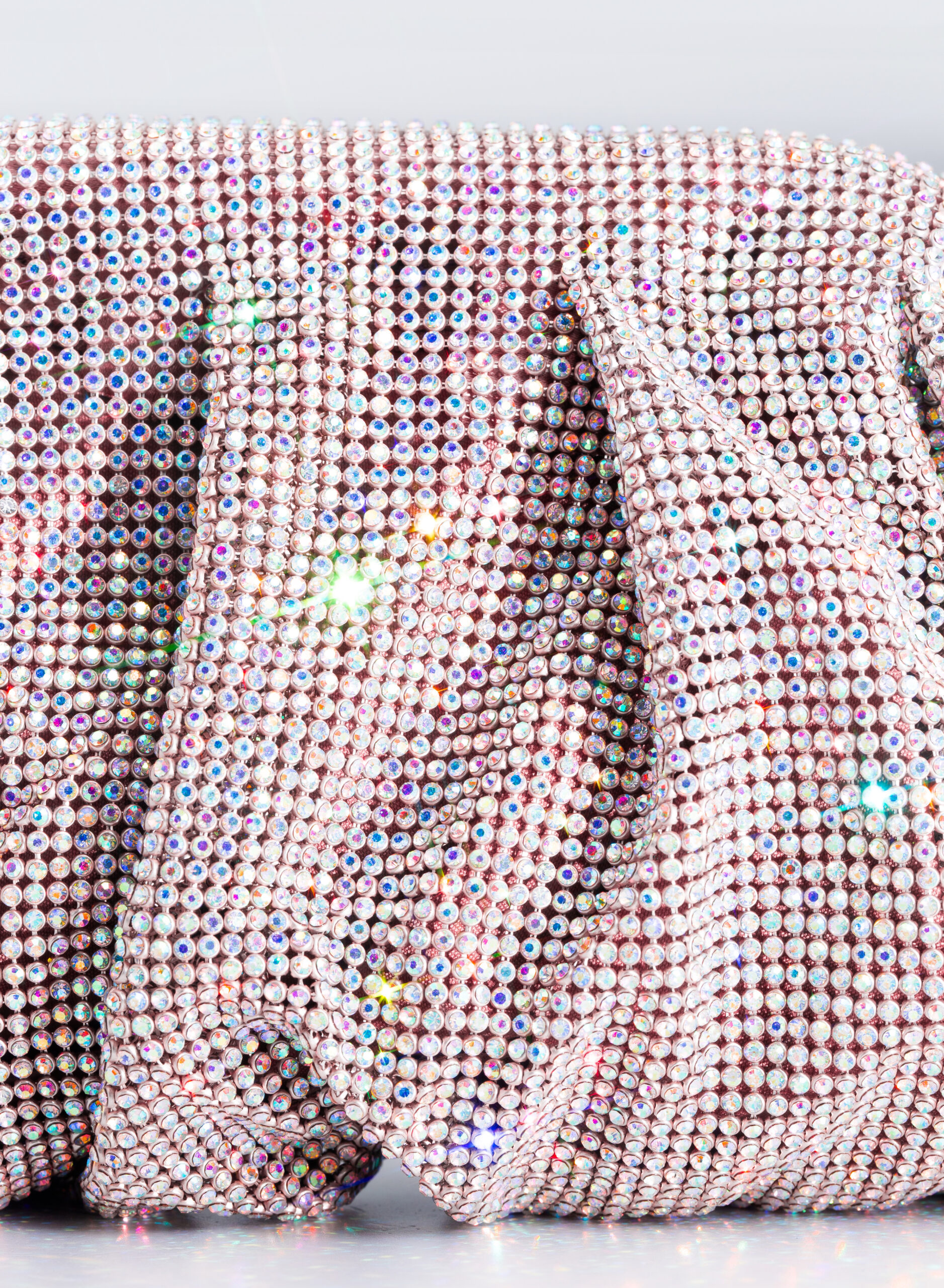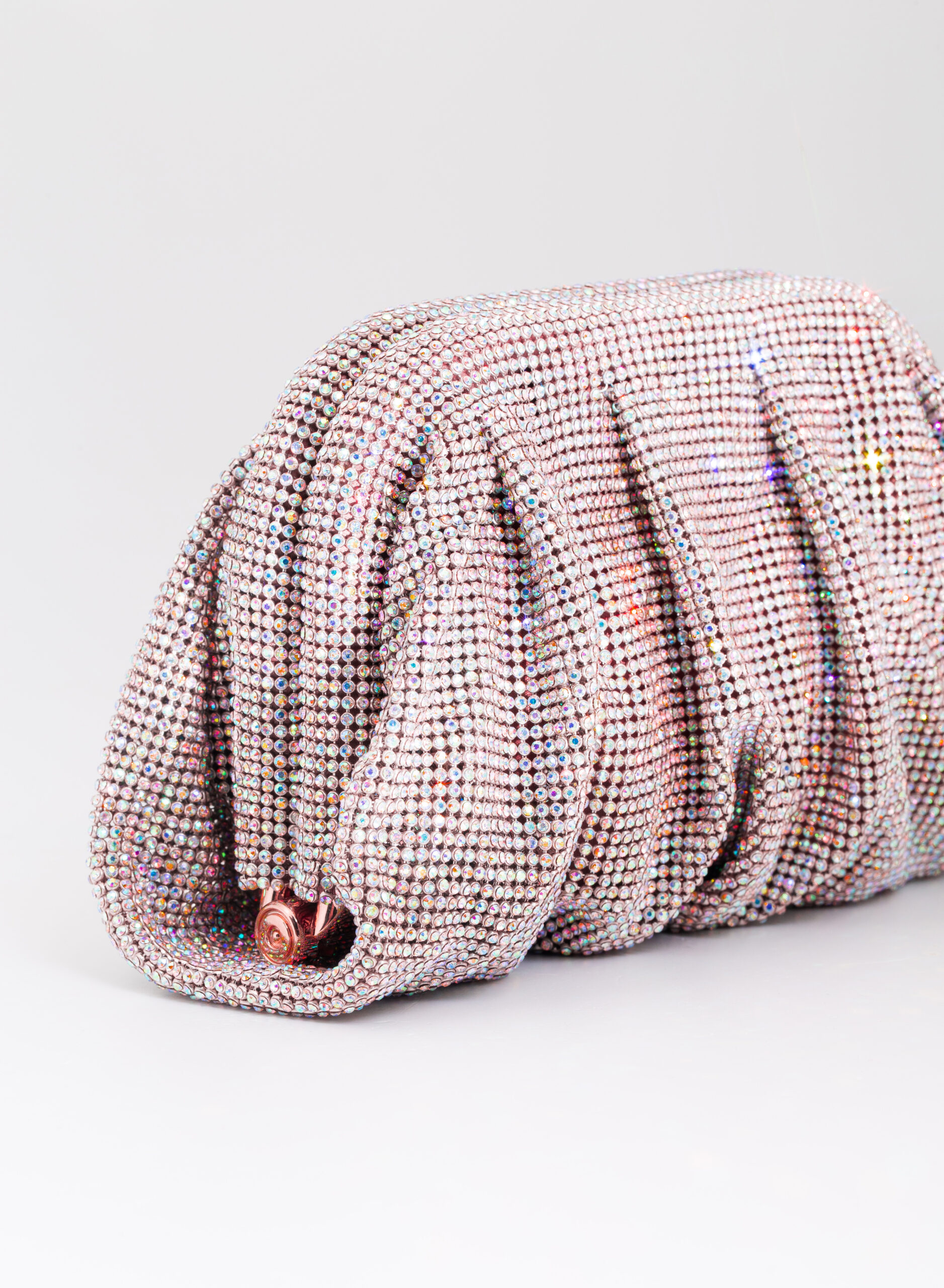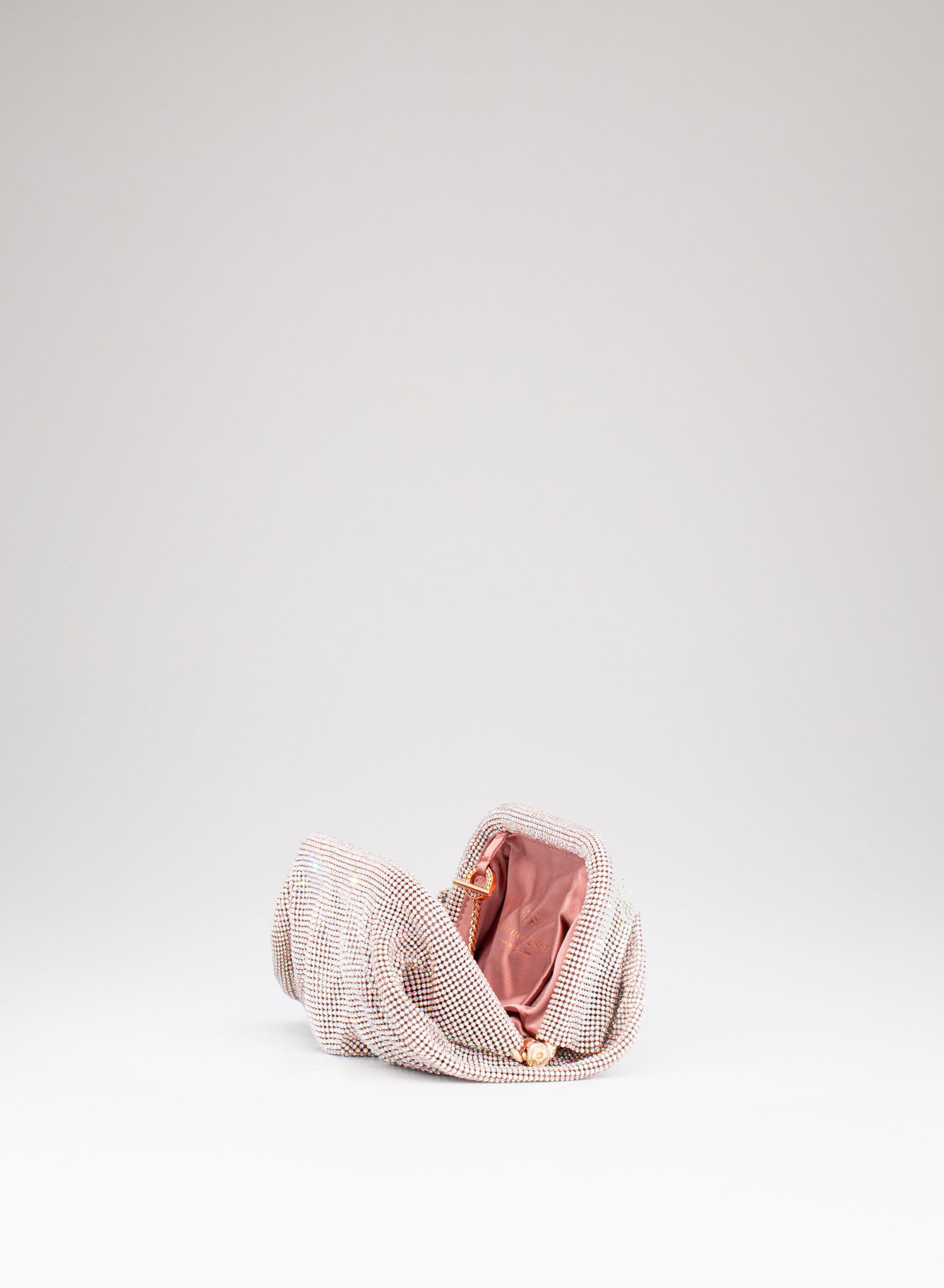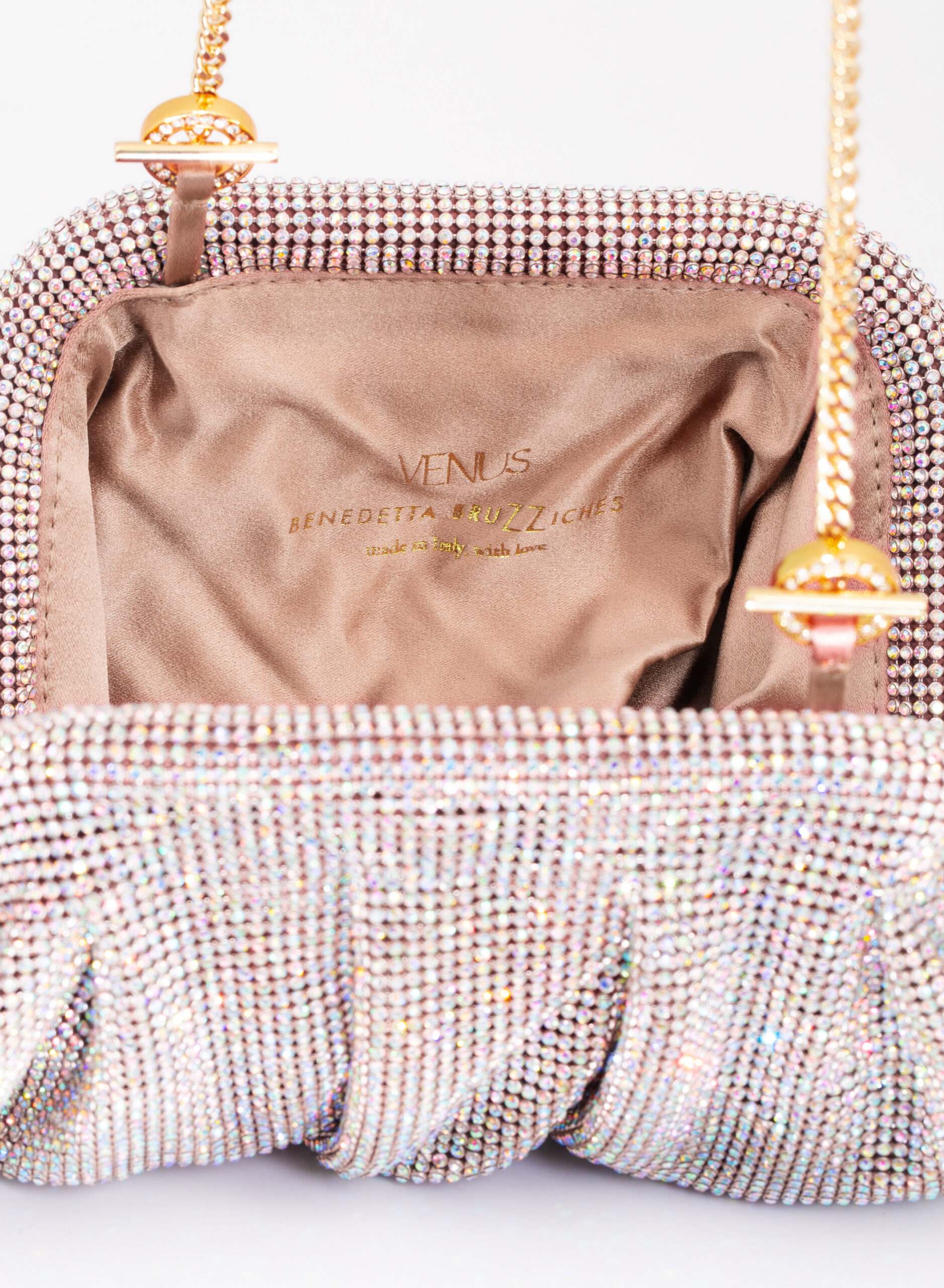 I welcome the love that flows through me like a wave that rolls, breaks on the rock and foams. Like a shower that smokes, boils and fertilizes the burning earth. Like a perfume that rises from the sea, it spreads and saturates the air around. So my body is reborn on Venus. This clutch is a tribute to the goddess of Love and Beauty and the magical moment in which every woman, who loves and is loved, is transformed. From mortal becomes goddess in a perfect personification of Venus. With soft and wavy shapes, Venus is made with a network of sparkling crystals sewn by hand with the same attention that would be devoted to a jewel. Inside, a silk satin clutch is ready to welcome the necessary for an evening out.