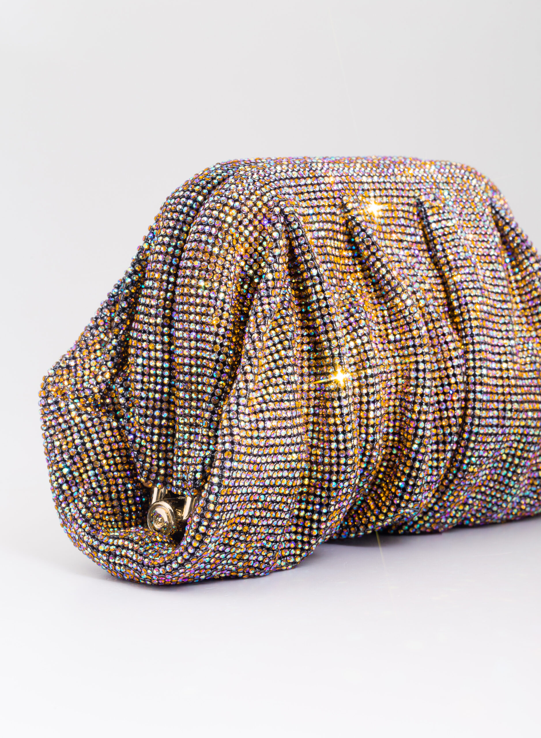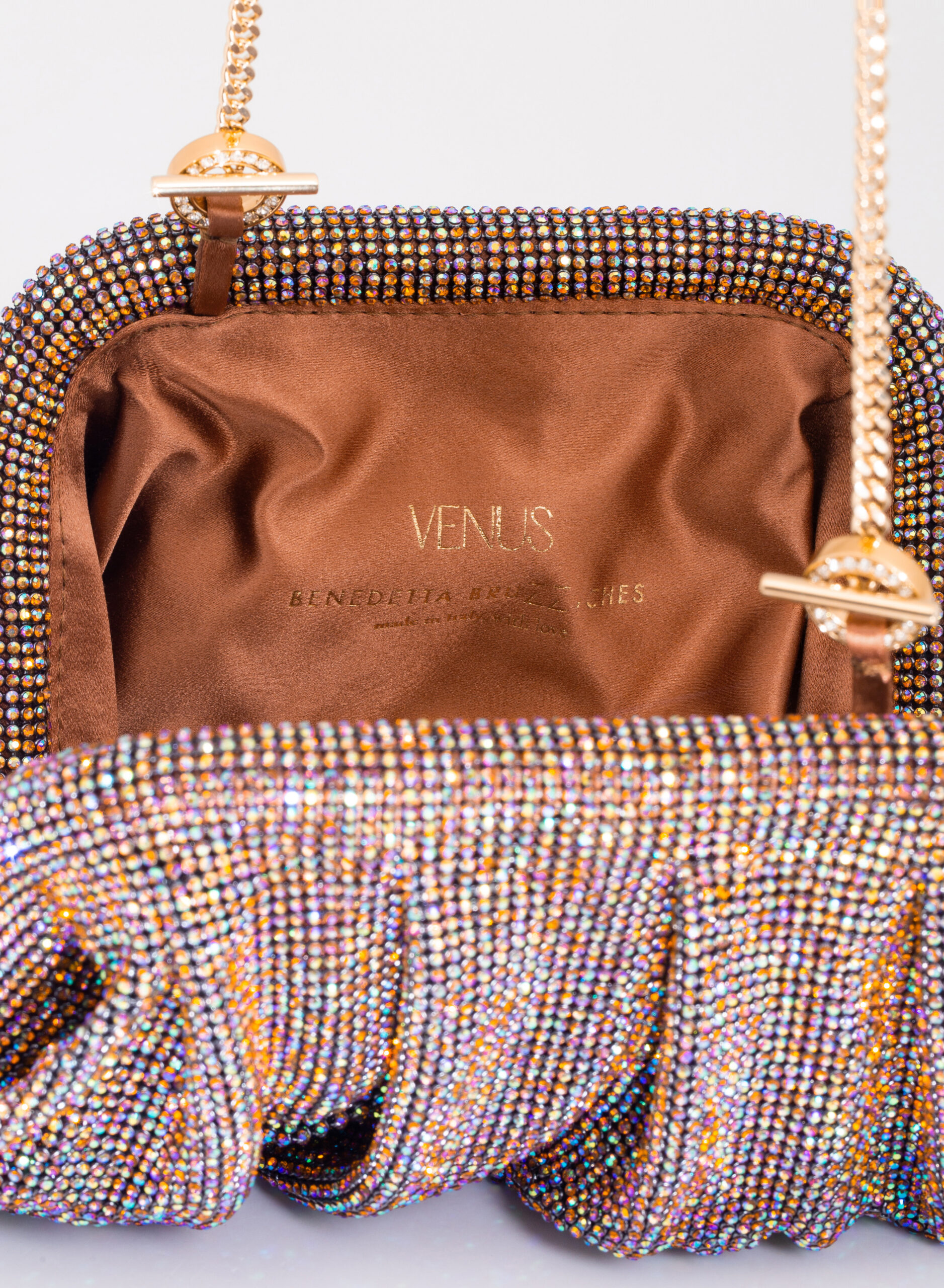 I welcome the love that flows through me like a wave that rolls, breaks on the rock and foams. Like a shower that smokes, boils and fertilizes the burning earth. Like a perfume that rises from the sea, it spreads and saturates the air around. So my body is reborn on Venus. This clutch is a tribute to the goddess of Love and Beauty and the magical moment in which every woman, who loves and is loved, is transformed. From mortal becomes goddess in a perfect personification of Venus. With soft and wavy shapes, Venus is made with a network of sparkling crystals sewn by hand with the same attention that would be devoted to a jewel. Inside, a silk satin clutch is ready to welcome the necessary for an evening out.