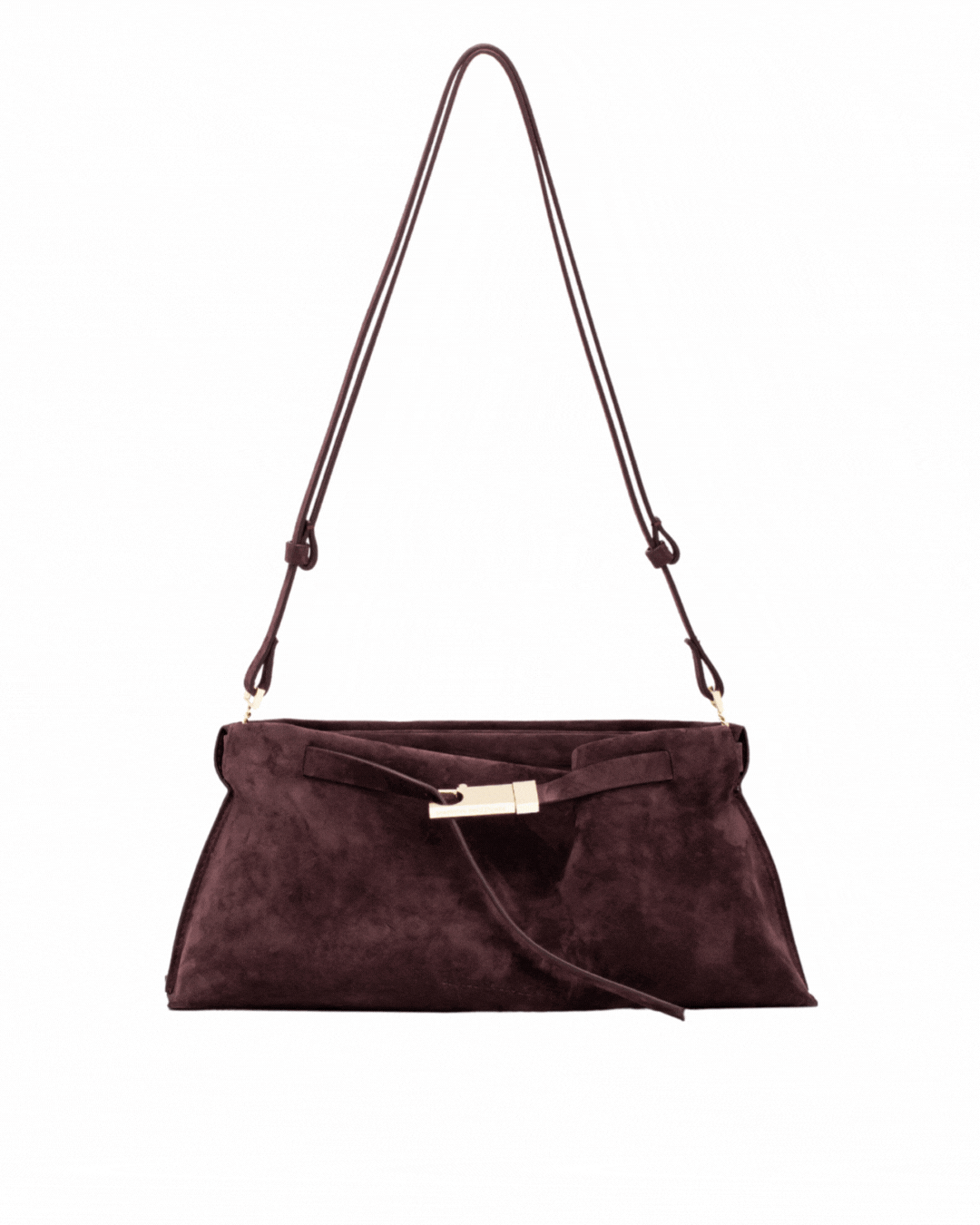La tracolla è scorrevole, pensata per accompagnare i gesti, non per ostacolarli. A spalla, crossbody, o a mano come una pochette.